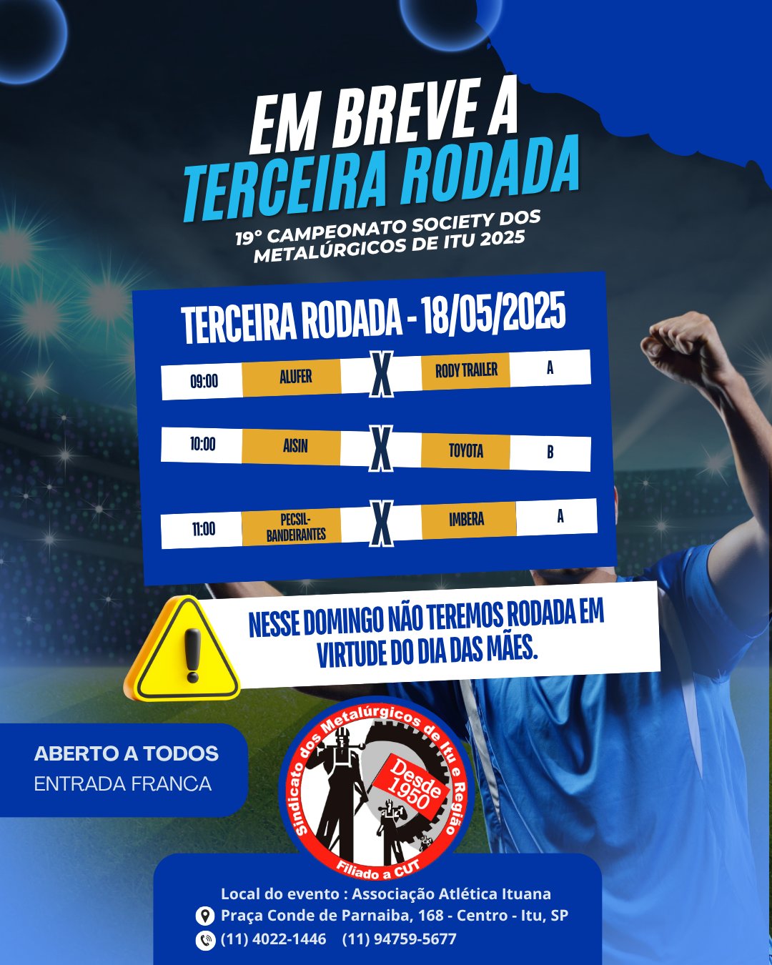 Mas atenção, nesse domingo não haverá rodada em virtude do dia das mães, a terceira rodada ocorre no dia 18/05/25 co...